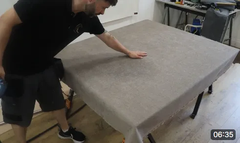 You'll learn why you should always cover your work bench with fabric when upholstering any furniture and how to cover it.