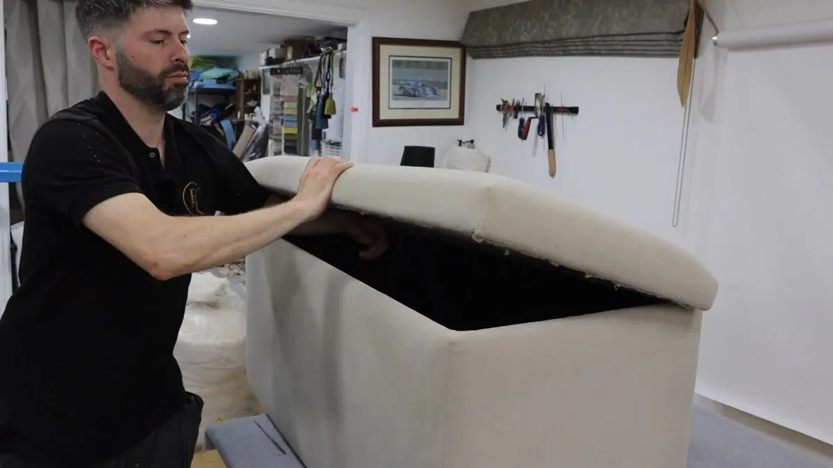 In this video I show you how to measure, cut and upholster the lid of the ottoman box.